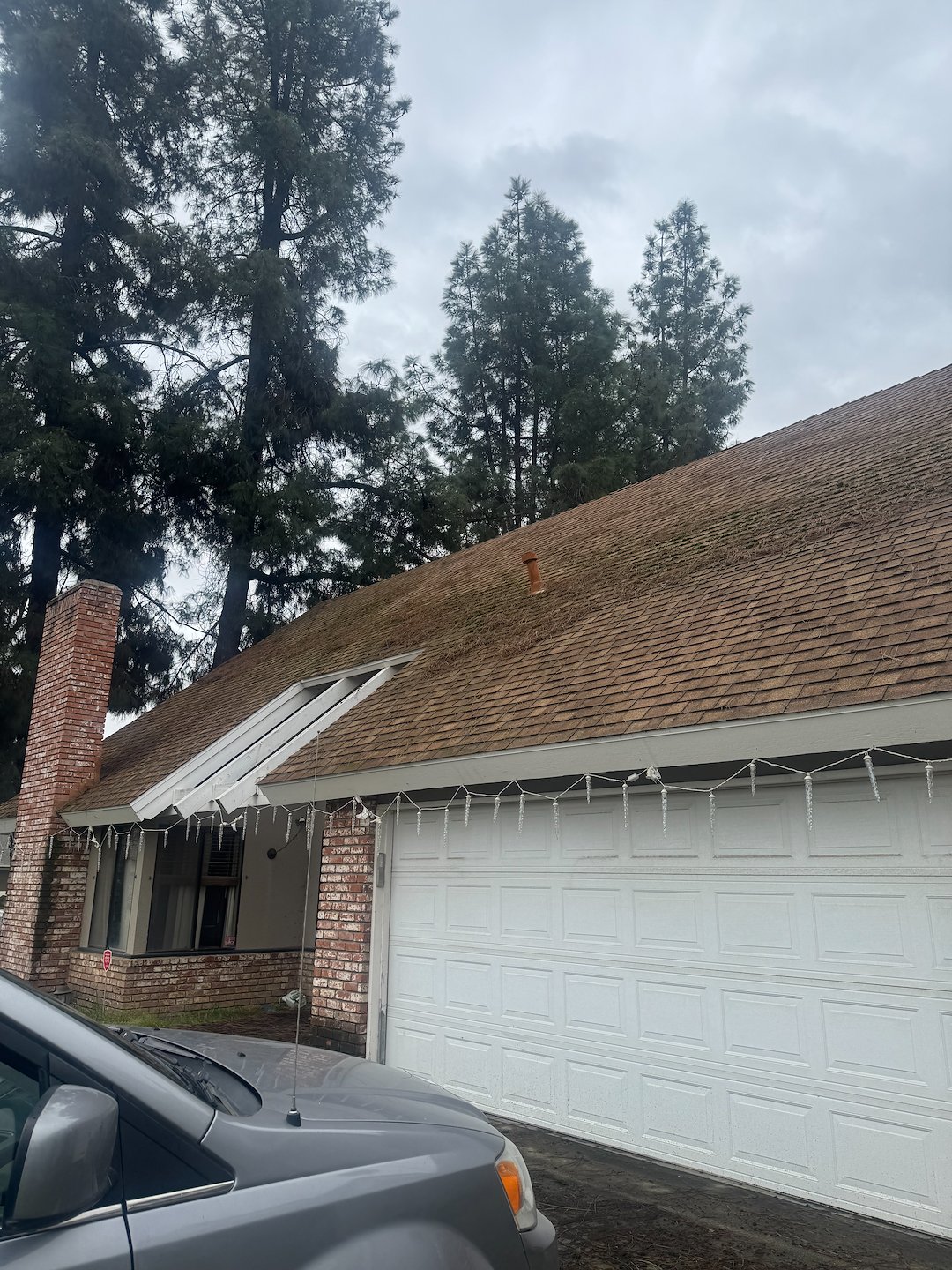 Like many homes in the Central Valley, the roof had developed dark algae stains (commonly mistaken for dirt), along with moss and organic growth. Insurance providers are becoming stricter about roof conditions, and buildup like this can lead to policy non-renewal or denial of coverage.
